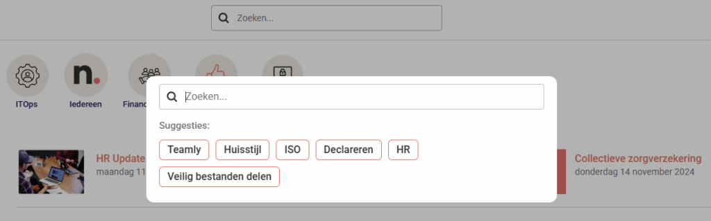 Met zoek-suggesties kun je vooraf instellen welke trefwoorden in de pop-up van de zoekbalk verschijnen. Dit helpt gebruikers om sneller relevante resultaten te vinden. Let op, dit is alleen in te stellen door admin-gebruikers.