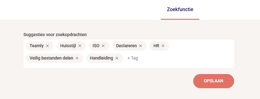 - Bij ‘Suggesties voor zoekopdrachten’ kun je de gewenste tags invoeren. Typ een woord en druk op enter om het toe te voegen. Klik op het kruisje om een zoekwoord te verwijderen.